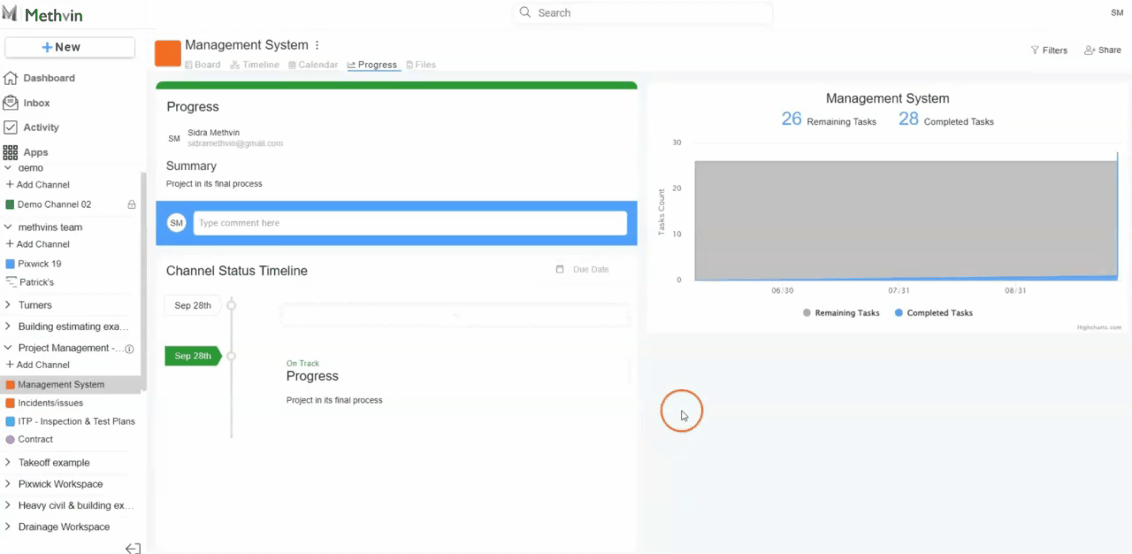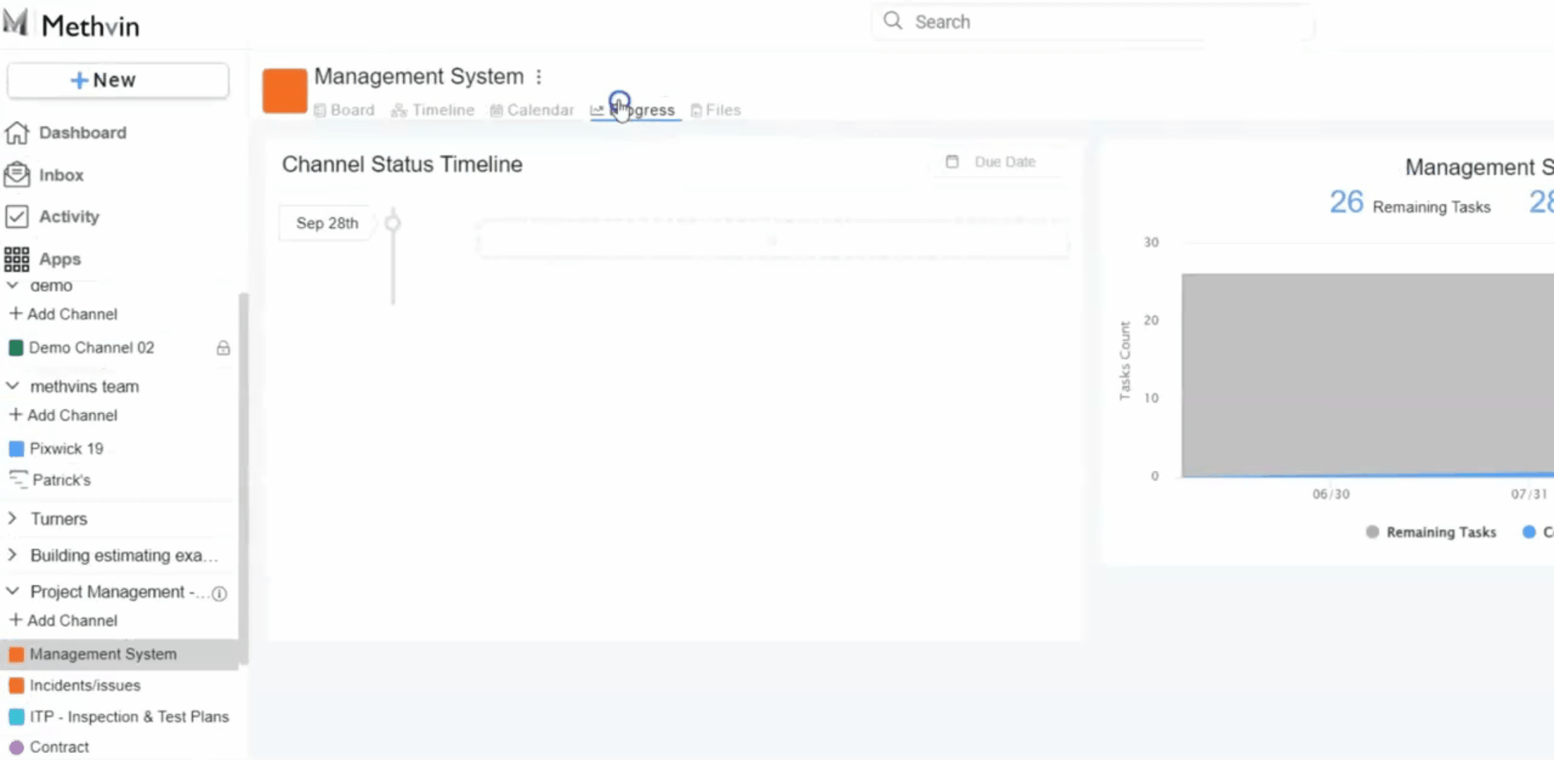 The Progress View offers a detailed overview of the project’s current status, allowing users to track progress and make updates as the project evolves. It includes a Channel Status Timeline on the left and a Progress Graph on the right.