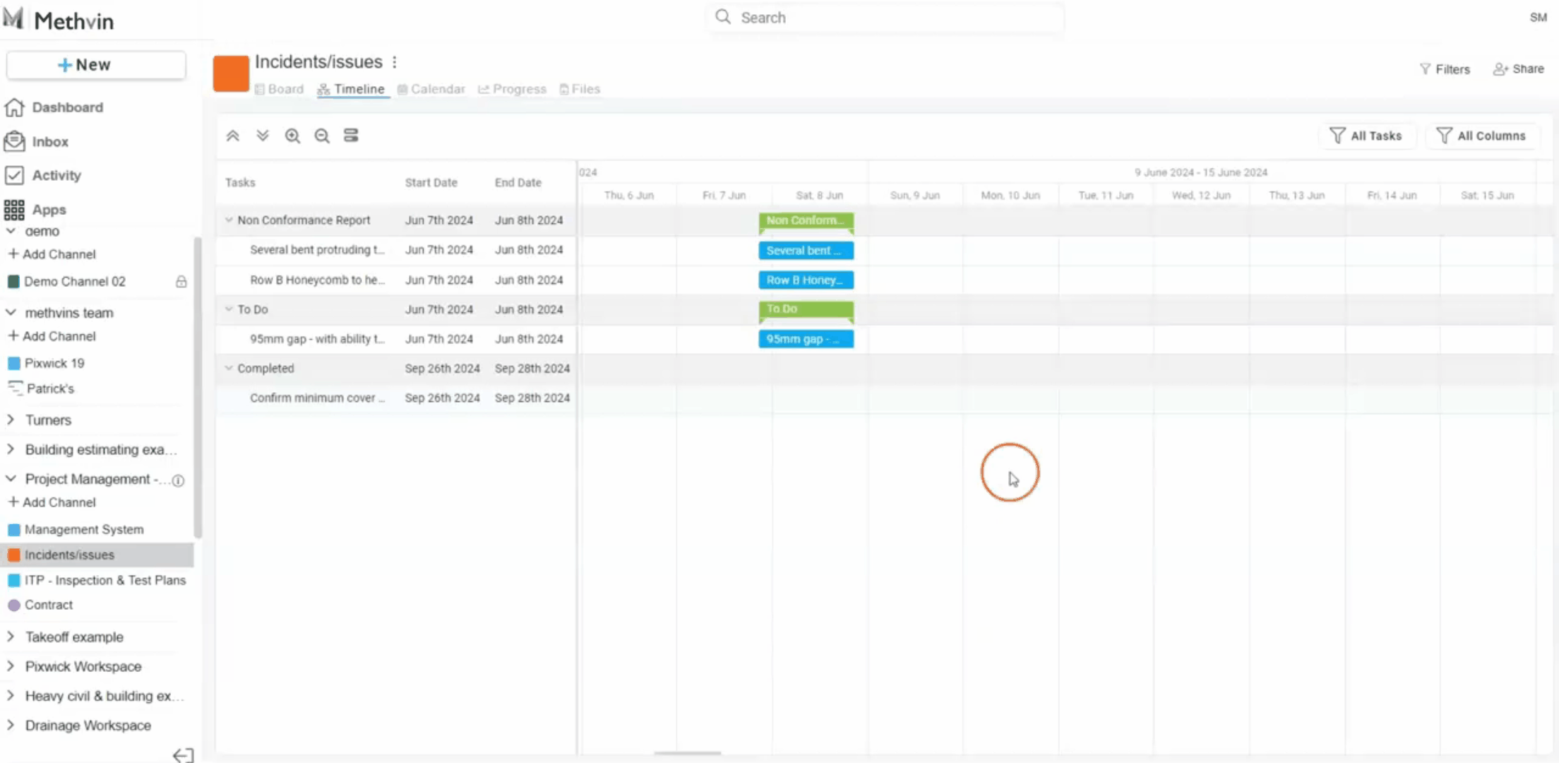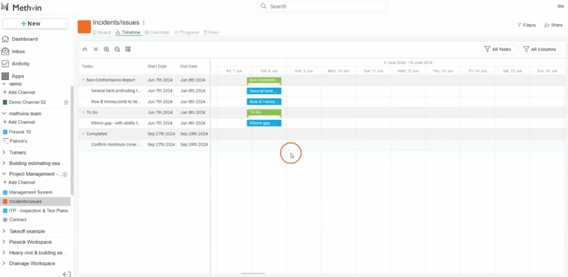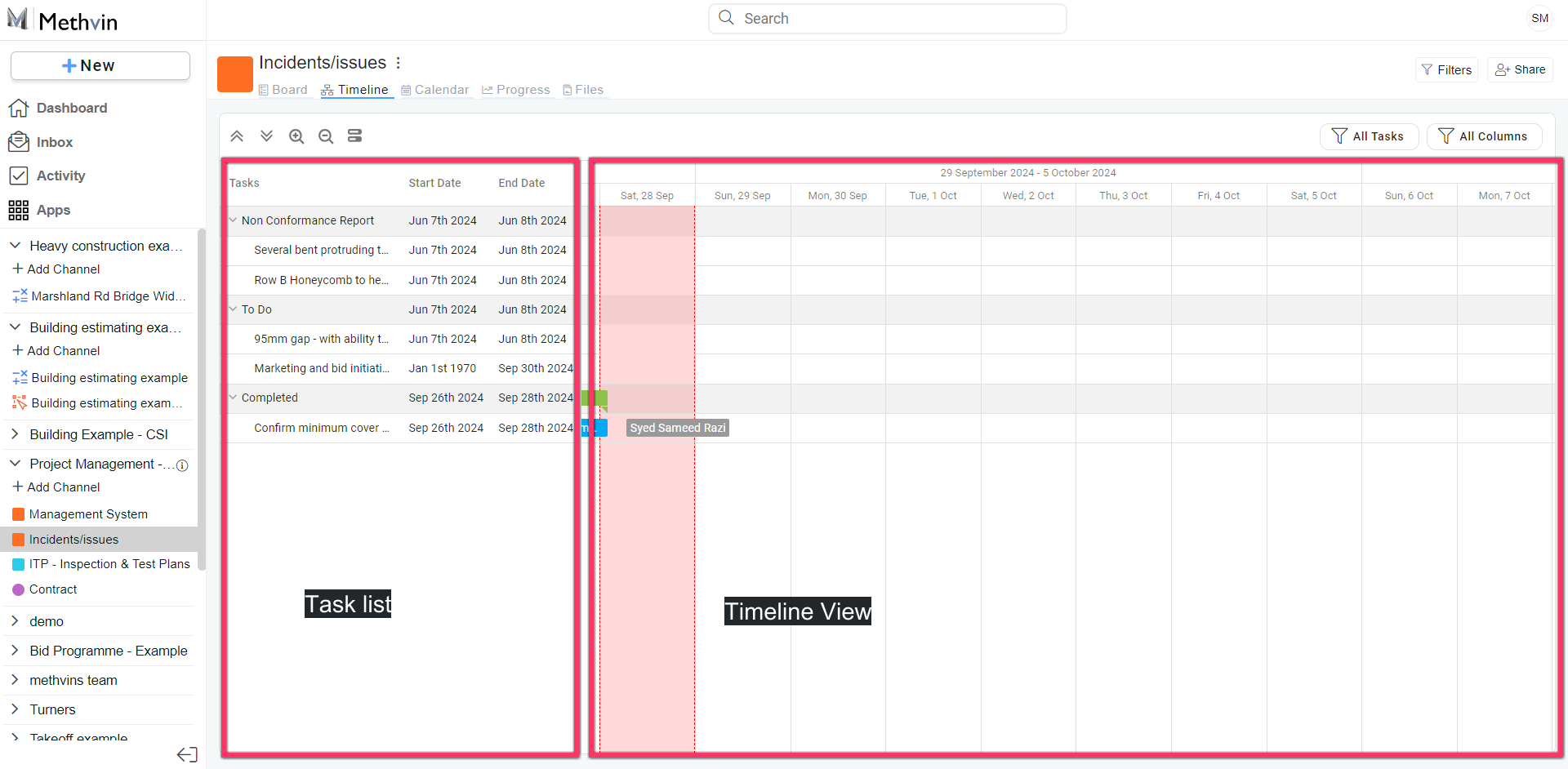 - All Tasks/Assigned Tasks Filter: Users can filter tasks displayed on the timeline by selecting between viewing All Tasks or only tasks Assigned to specific members of the workspace.