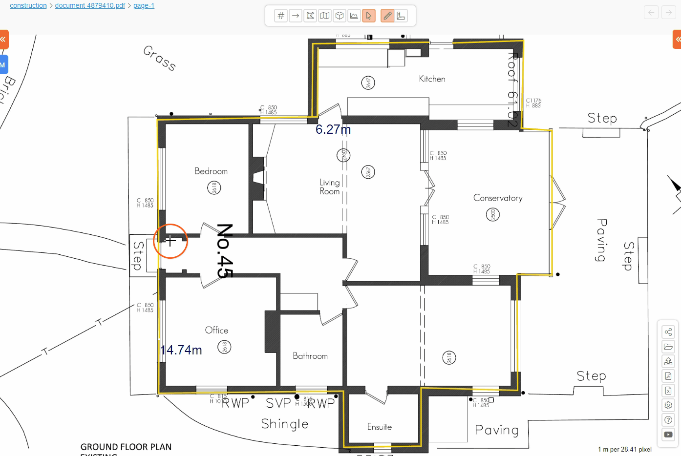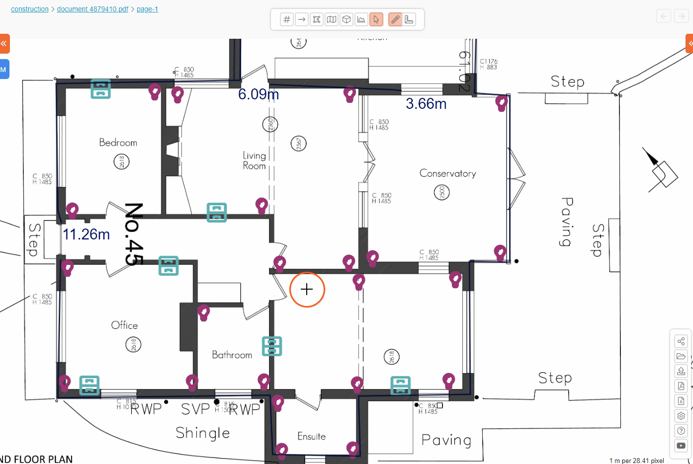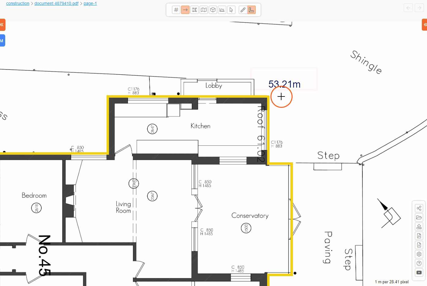 The “Access Properties” feature allows you to change the color, adjust the opaqueness, set the line width and style, and display quantity text for a measurement. This helps in better visualization and organization of your measurements on the plan. You can access and adjust various properties of a measurement to customize its appearance and how it displays on your plan. Follow these steps to access and modify measurement properties,