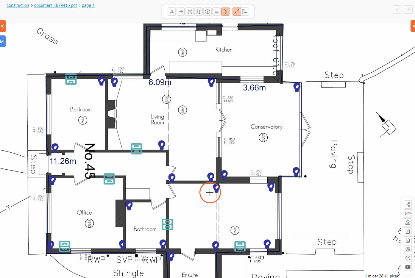 The “Access Properties” feature allows you to change the color, adjust the opaqueness, set the line width and style, and display quantity text for a measurement. This helps in better visualization and organization of your measurements on the plan. You can access and adjust various properties of a measurement to customize its appearance and how it displays on your plan. Follow these steps to access and modify measurement properties,