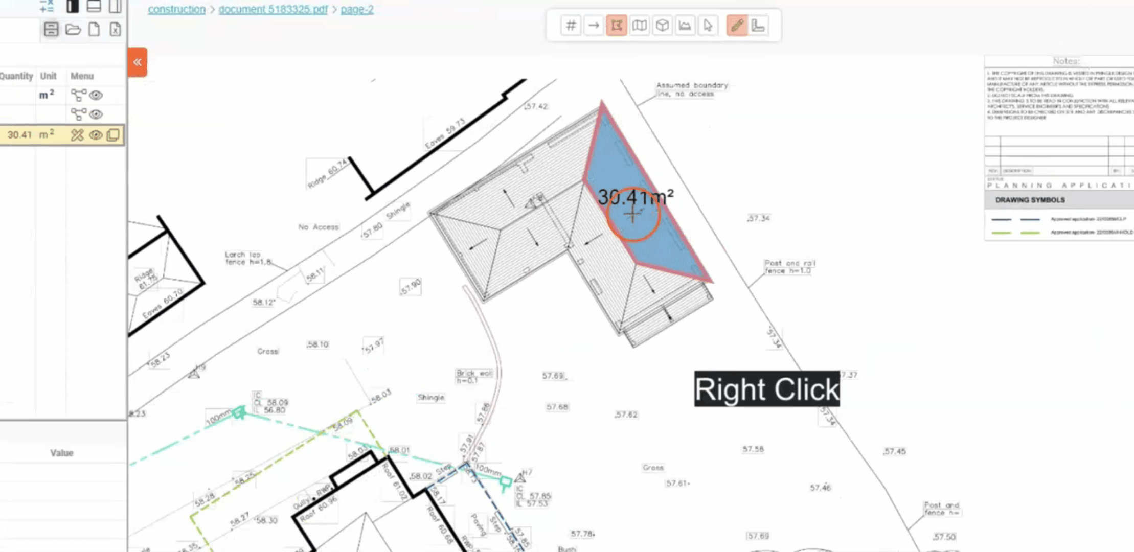The Grade/Pitch feature allows you to specify the grade or pitch of a measurement on your plan, ensuring accurate representation of slopes, inclines, or angles. This tool is essential to set precise angle of elements like roofs, ramps, or drainage systems. By setting the grade or pitch, you can enhance the accuracy of your measurements, leading to better project planning and execution. Follow these steps to set the grade or pitch for your measurements,
